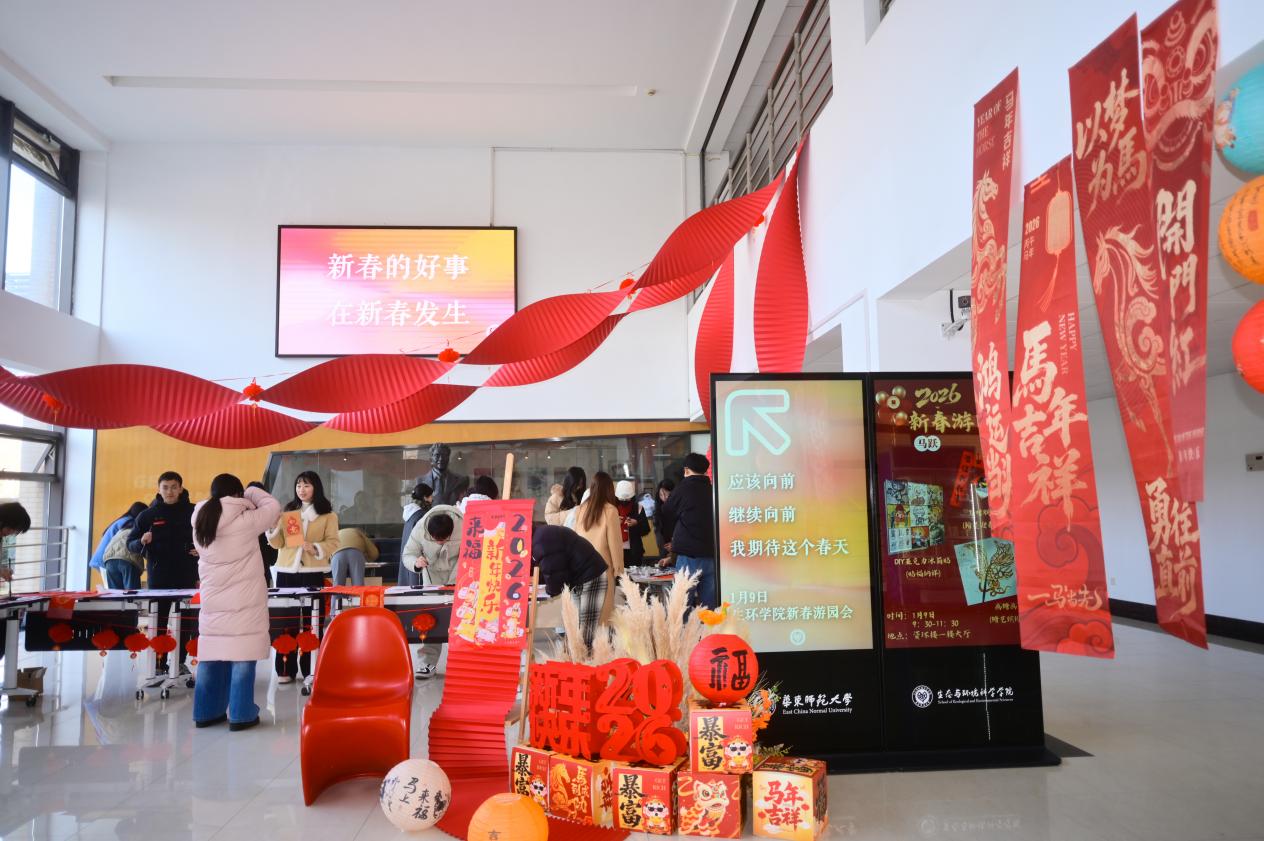 岁末临近,年味愈浓。为让师生在校园里感受到家的温暖,生态与环境科学学院研会生涯部的同学们提前一天就忙活起来,精心布置活动区域,点缀新春装饰。从红纸的铺陈到工具的归置,每一处细节都藏着用心,让资环楼一楼大厅洋溢着温馨喜庆的氛围。1月9日上午,这场融合传统与创意的新春游园会如约开启。糖画的甜香、笔墨的韵味、冰箱贴的巧思交织在一起,师生们亲手创作、欢笑互动,在热闹氛围中触摸真切的年味,为校园添满了浓浓的节日气息。笔墨飘香,对联寄情抒期许对联区红纸铺展、墨香四溢,是现场最具人气的角落。师生们挥毫泼墨,将新春期许凝于笔端。擅长书法的老师笔下,“骏马奋蹄探科研秘境,春风送暖结学术硕果”等春联一气呵成;初学
