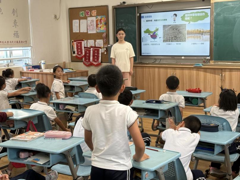 2025年10月14日、15日,生态环境小课堂讲师团、研会秘书部的成员们前往华东师范大学附属紫竹小学和永德学校开展环教课,本次课程的主题为“绿色星球的sos:救救荒漠化的家园”,讲师为林相君、何雨晴和马铭苒同学。