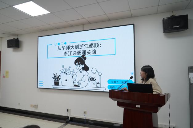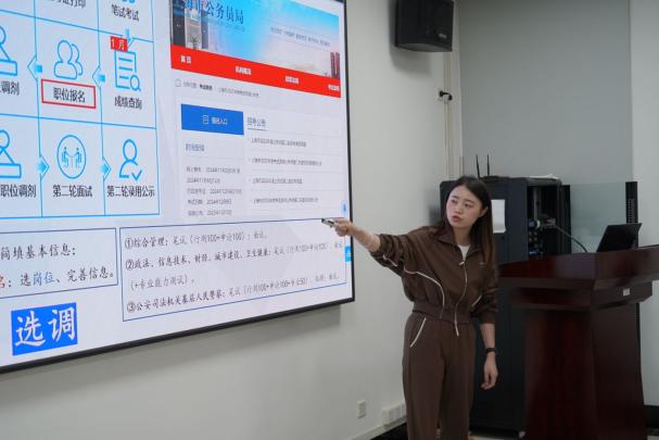 第一位分享嘉宾包洁欢现就职于浙江省泰顺县委组织部组织科。她从职业选择动机切入,结合经济活力、职业发展和相关政策三个方面,深入分析了选调生的独特优势。她系统梳理了报考的关键时间节点,并聚焦笔试与面试环节,详细讲解了申论的答题结构与结构化面试技巧,更从考官视角分享了面试中的加分细节与常见误区。最后,她通过分享亲身经历的基层工作故事,让同学们对选调生的职责与使命有了更为深刻的认识。
