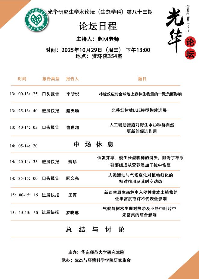 2025年10月29日下午13:00,生态与环境科学学院第83期研究生光华学术论坛(生态学科)在资环楼354室顺利举行,本期论坛由赵明老师主持,点评嘉宾为陈迎老师和宋月青老师。