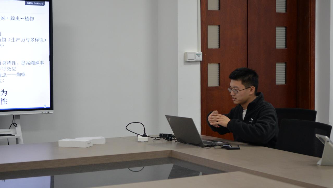 第一位汇报人是郝佳华同学,他口头报告的题目为《土地利用下舟山淡水水体浮游细菌的生物地理格局及机制》。他的汇报内容聚焦舟山群岛14个岛屿99个水体的淡水浮游细菌,发现土地利用通过改变小水体硝态氮和大水体铵态氮含量,影响蓝细菌多样性,导致浮游细菌传统种面积关系丧失,且该影响在100-150米缓冲区范围内最显著。第二位汇报人是黄静同学,她进展快报的题目为《颗粒有机碳与微生物生活史策略调控亚热带森林土壤微生物碳利用效率对干旱的响应》。她的汇报基于全球多个气候带森林土壤的研究,表明微生物碳利用效率(CUE)随土层深度增加而下降,表层土壤CUE受微生物多样性主导,深层土壤受理化保护因素控制,基质质量和可利用性是关键驱动因子。第三位汇报人是张博博同学,他口头报告的题目为《氮添加改变了生态系统的下行效应从而抑制了植物多样性》。研究中的草地控制性实验显示,氮添加会改变生态系统效应,通过让优势植物改变叶片性状、提高蜘蛛捕食成功率抑制蝗虫,使系统从下行效应转为上行效应,最终抑制植物多样性。第四位汇报人是吴政澜同学,她口头报告的题目为《气候变化和陆源输入降低了未来北冰洋生物碳泵的效率》。该研究利用FESOM2.1–REcoM3模型模拟发现,气候变化和陆源输入虽提升北极海洋净初级生产力,但通过增强再矿化、改变浮游植物群落结构等,导致生物碳泵效率下降,使北极从“碳汇”向“碳源”转变的风险上升。