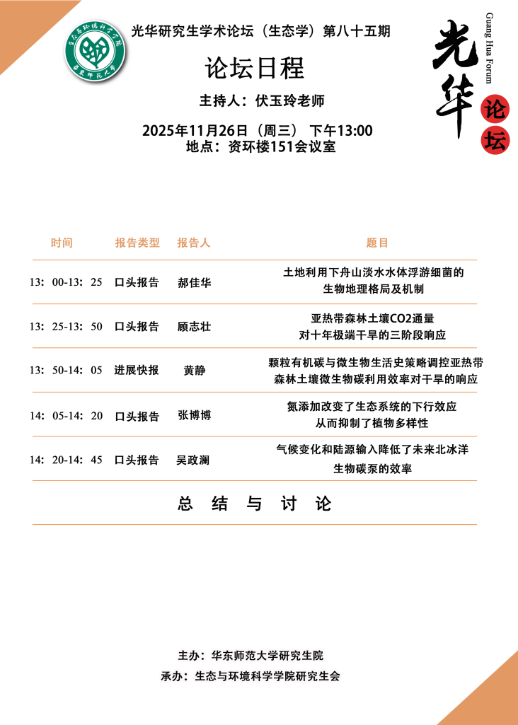 2025年11月26日下午13:00,生态与环境科学学院第85期研究生光华学术论坛(生态学科)在资环楼151室顺利举行,本期论坛由学院伏玉玲老师主持,点评嘉宾为伏玉玲老师、王辛辛老师和郑泽梅老师。