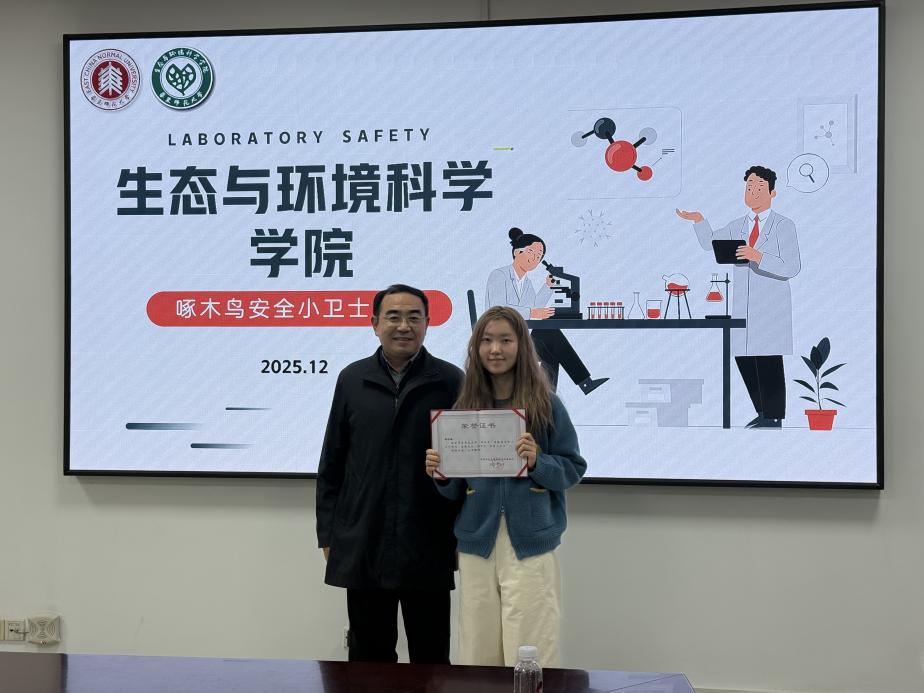 培训会上,王娟老师首先为2024级“啄木鸟”小卫士颁发纪念礼品,肯定并感谢他们过去一年在实验室安全管理工作中作出的努力。随后,她为新聘任的2025级实验室小卫士颁发了聘用证书,明确了新一批小卫士的职责,勉励大家认真履责、勇于担当。为进一步激励先进,李茂田处长向2024级优秀小卫士胡秋凝颁发了荣誉证书,对其过去一年的突出表现予以表彰,并号召全体成员向榜样学习。
