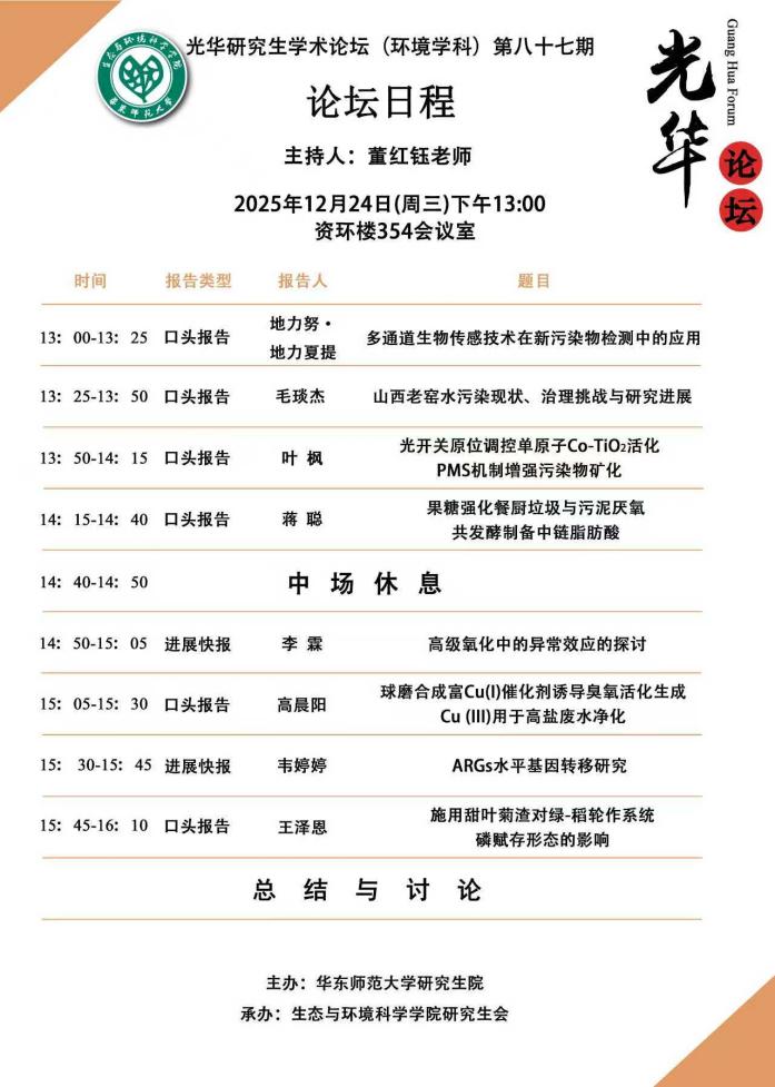 2025年12月24日下午13:00,生态与环境科学学院第八十七期研究生光华学术论坛在资环楼354室顺利举行。本期论坛由生态与环境科学学院董红钰老师主持,点评嘉宾为刘富强老师。