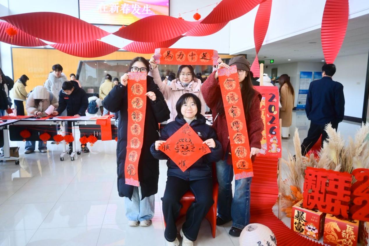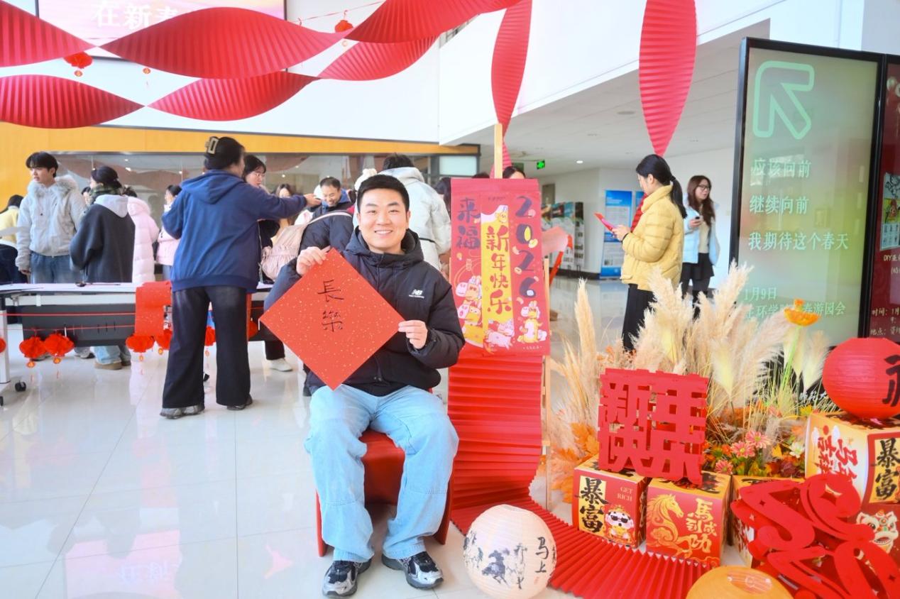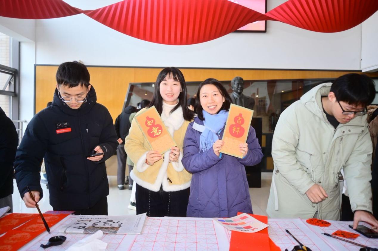 对联区红纸铺展、墨香四溢,是现场最具人气的角落。师生们挥毫泼墨,将新春期许凝于笔端。擅长书法的老师笔下,“骏马奋蹄探科研秘境,春风送暖结学术硕果”等春联一气呵成;初学的同学虽笔画稚嫩,却也在一笔一划里写满真诚。各式字体的“福”字、“如意”“安康”等吉祥词跃然纸上,这份亲手书写的祝福,比印刷的春联多了一份心意,也让传统文化的根脉在笔墨间扎根。