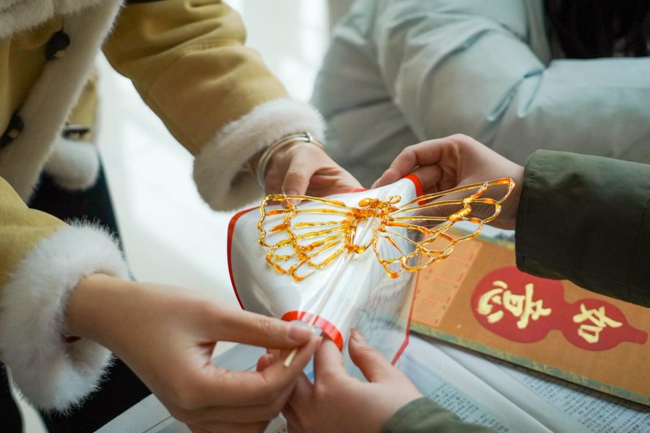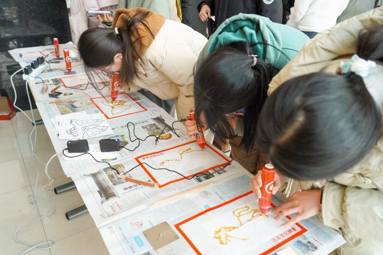 糖画区始终萦绕着麦芽糖的甜香,是游园会最具童趣的地方。“熬得金黄的麦芽糖在铜勺中流转,执笔人手腕轻转,银丝般的糖浆便在石板上勾勒出祥龙、兔子等造型。待糖浆凝固,晶莹的糖画便完成了。咬上一口,甜意漫开,瞬间勾起童年攥着糖画奔跑的回忆。”同学们用糖画笔制作出形态各异的糖画作品,欢声笑语中,传统民俗的魅力在指尖与舌尖传递。