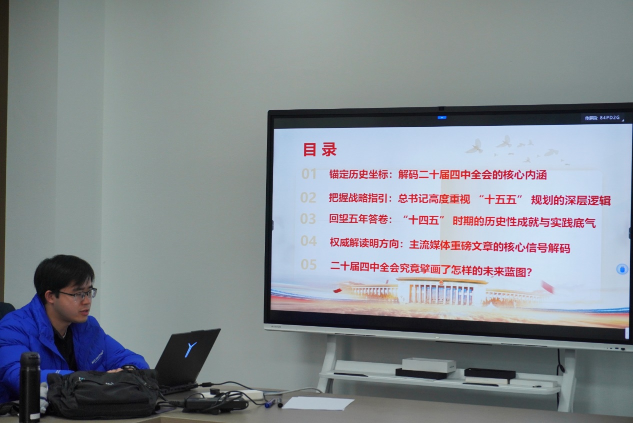 随后,赵午阳聚焦全会精神中关于生态文明建设的专项部署进行了深入解读。他强调,全会系统阐述的“六个坚持”根本原则中,“坚持高质量发展”与“坚持统筹发展和安全”二者与生态环境保护工作内在统一、密不可分。全会明确要求以实现碳达峰碳中和目标为战略引领,系统推进降碳、减污、扩绿、增长的协同增效。结合权威政策解读,他进一步分析指出,“十五五”时期将是推动我国生态环境质量实现根本性改善的关键五年。作为环境专业的研究生,必须深刻领会并自觉对接全会部署的重大战略任务,包括持续深入打好污染防治攻坚战、加强生态系统保护与修复等,主动将学术研究与专业能力提升融入国家发展的宏观战略需求之中。