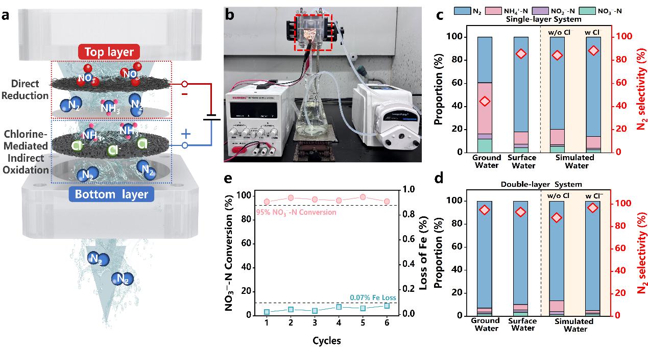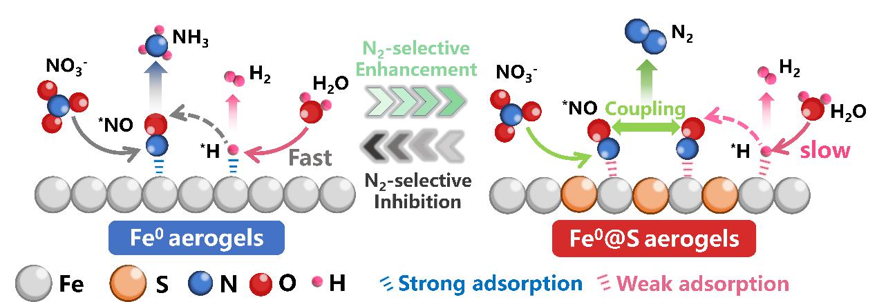 长期以来,硝酸盐是全球范围内备受关注的污染物之一,尤其在农业和工业活动较为密集的地区,水体中常常存在较高浓度的硝酸盐。硝酸盐的积累不仅会导致水体富营养化,影响水质,还可能通过食物链进入人体,最终转化为致癌的N-亚硝基化合物,对公共健康构成威胁。因此,如何高效、无害化地去除水中的硝酸盐成为亟待解决的环境问题。电化学硝酸盐(NO3⁻)还原为氮气(N2)被认为是一种富有前景的硝酸盐无害化治理方法,但由于氮氮三键的强大键能,氮气的生成通常十分困难。此外,传统的电催化还原过程还常会遇到*NO中间体耦合速度慢及*H供给过量的问题,从而限制了硝酸盐的转化效率和选择性。为此,华东师范大学生态与环境科学学院关小红团队孙远奎课题组设计了一种硫掺杂零价铁(Fe0@S)气凝胶材料,利用其独特的结构和物理化学特性,通过调节*NO的耦合和*H的供给,成功实现了NO3⁻定向还原为N2,氮气选择性可达90%以上。