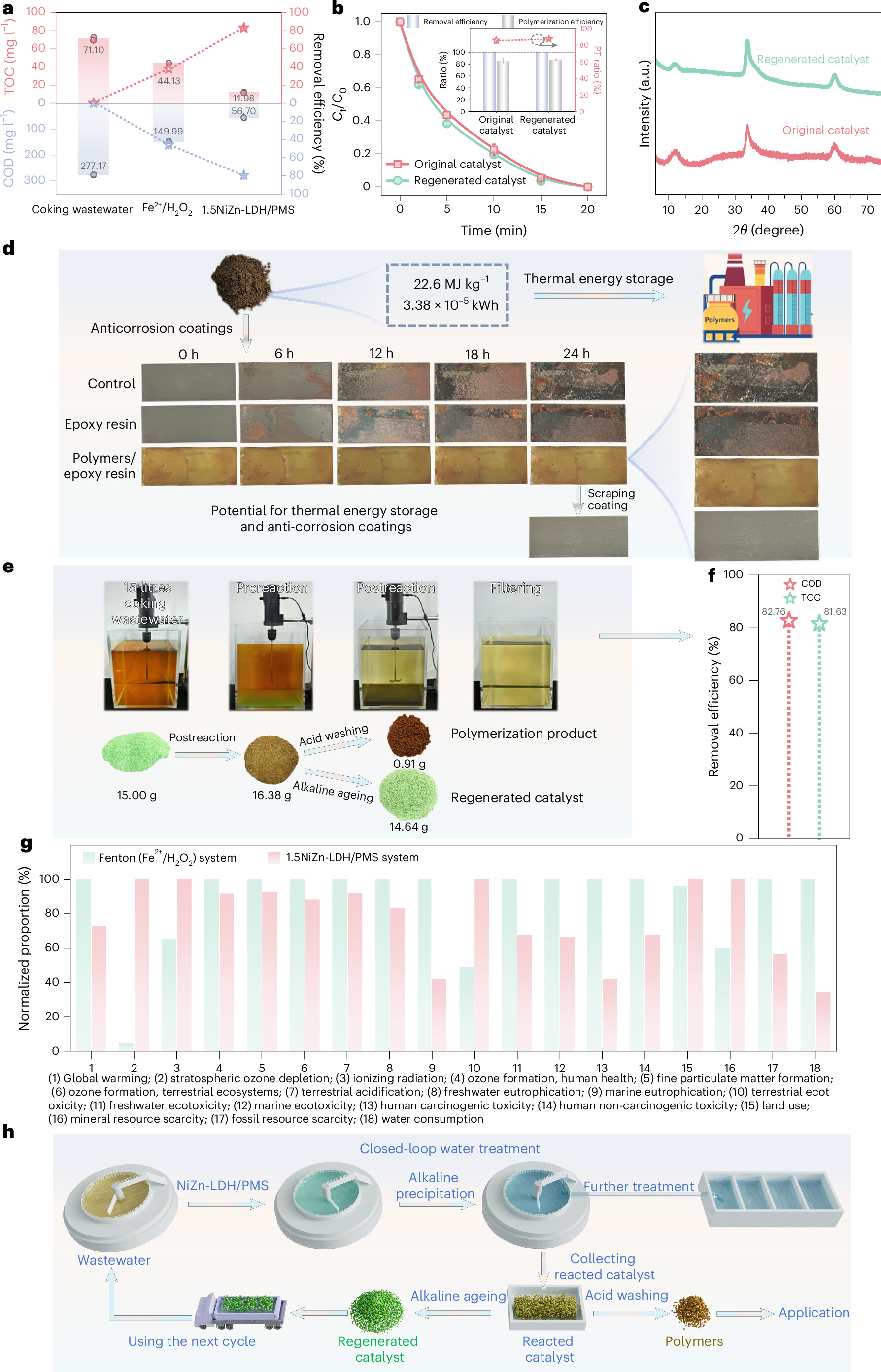 研究发现,NiZn-LDH表面的两性≡Zn(OH)2基团可在反应过程中原位形成自缓冲的中性微环境,从而避免传统体系酸化导致的金属流失,并稳定富集Ni物种,高效活化PMS生成高价Ni(IV)=O活性物种,进而通过PCET机制定向诱导酚类污染物发生聚合。生成的聚合产物可通过简单酸洗回收,并进一步用于防腐涂层材料;催化剂则可通过碱性老化处理酸洗液实现近完全再生与循环使用。在15 L工业焦化废水的验证实验中,该体系实现了COD去除率82.8%、TOC去除率81.6%,回收聚合物0.91 g,催化剂再生率达到97.6%。该系统集选择性污染物去除、聚合产物增值利用与催化剂循环再生于一体,为工业废水处理提供了一种低碳、闭环的新策略。
