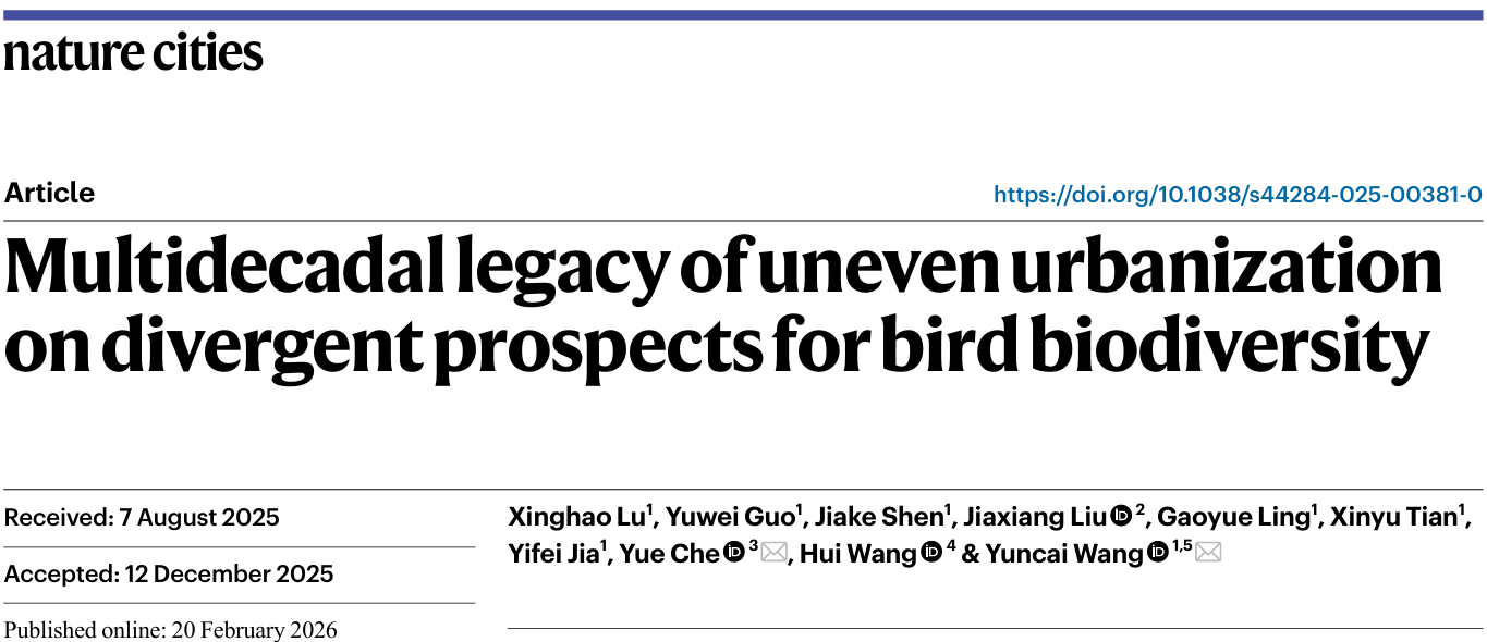 相关研究成果以“Multidecadal legacy of uneven urbanization on divergent prospects for bird biodiversity”为题2026年2月20日发表于《自然·城市》(Nature Cities)。华东师范大学生态与环境科学学院车越教授与同济大学建筑与城市规划学院王云才教授为本文的共同通讯作者。