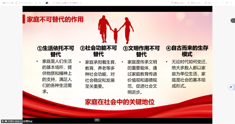 活动最后,主持人作总结发言并向全体党员发出倡议,明确提出三点要求:一是提高思想站位,深刻认识家庭家教家风建设的重要意义,将其作为修身律己、廉洁齐家的重要抓手;二是厚植家风底蕴,从自身做起、从家庭做起,自觉传承中华优秀传统家庭美德,赓续红色家风血脉;三是彰显党员担当,充分发挥先锋模范作用,在学习、科研与生活中躬身践行优良家风,以自身行动带动身边人,共同营造崇德向善、风清气正的良好氛围。