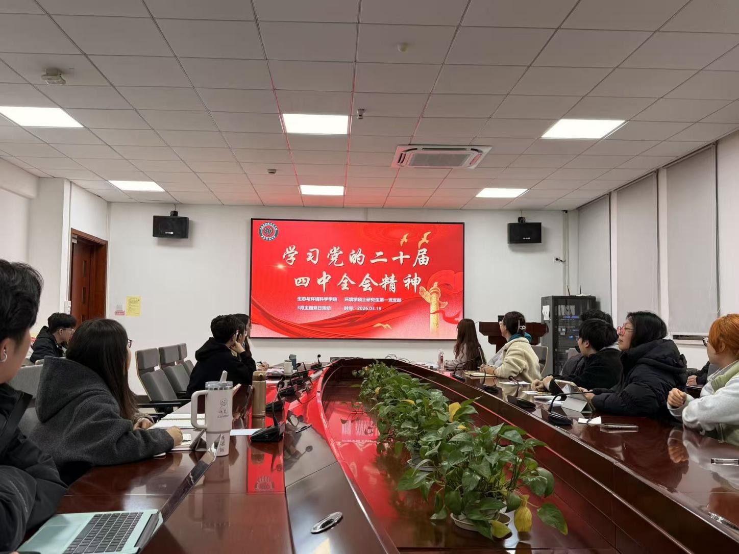 为深入学习贯彻党的二十届四中全会精神,推动全会精神与环境工程专业实践深度融合,引导支部青年党员把思想和行动统一到党中央决策部署上来,2026年3月19日下午15:00,生态与环境科学学院环境学硕士研究生第一党支部在资环楼269会议室开展“学习贯彻党的二十届四中全会精神:学全会精神-悟初心使命-强担当作为”主题党日活动。支部书记刘盈盈同志担任主讲人领学全会精神,支部全体党员参与学习,顾佳艳老师出席活动。