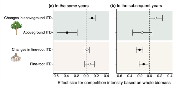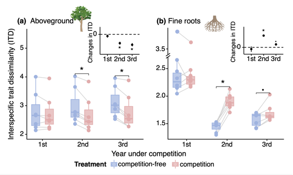 在自然群落中,树木个体之间持续围绕光照、水分和养分等关键资源展开竞争。基于性状的生态学研究,通常通过功能性状来描述物种的资源利用策略,并利用种间性状差异(interspecific trait dissimilarity, ITD)来理解竞争强度及其结果。然而,这一框架往往默认功能性状及种间性状差异是相对固定的属性。例如,较高的株高通常意味着更强的光资源获取能力,较发达的根系则往往对应更高的地下资源利用能力。事实上,植物性状会随竞争发生变化,而当不同物种对邻体的响应方式不同时,种间性状差异本身也会随之改变。与此同时,树木的资源获取策略并非由单一性状决定,而是由多个地上和地下性状共同塑造。基于此,本研究分别在地上和地下多维性状空间中,检验邻体存在是否会改变物种间的功能差异,以及这些变化如何进一步影响竞争强度。