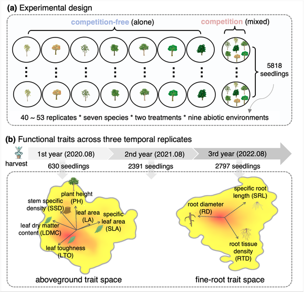 为回答这一问题,研究团队在中国浙江天童森林生态系统国家野外科学观测站开展了为期三年的温室幼苗实验(图1),纳入7个共存树种、5818株幼苗,设置无竞争与竞争两种处理,并在连续三年中测定每株幼苗的6个地上性状、3个细根性状及生物量。基于这些数据,研究团队分别构建了地上和地下多维性状空间,量化竞争条件下邻体诱导的种间性状差异变化,并进一步检验这些变化与竞争强度之间的关系。