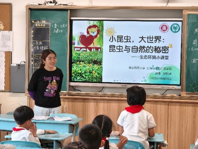2025年6月3、4日下午,生态环境小课堂讲师团和研会秘书部成员前往华东师范大学附属紫竹小学、永德学校开展环教课,本次环教课的主题为“小昆虫,大世界:昆虫与自然的奥秘”,担任本次课程的讲师为罗晓琳、朱圆圆和阮文亮同学。讲师们通过生动的案例和专业的讲解,带领小同学们深入了解昆虫的生物学特征、生态价值及演化历程,展现小昆虫在地球生态系统中的“大能量”。