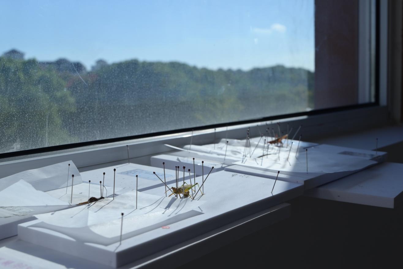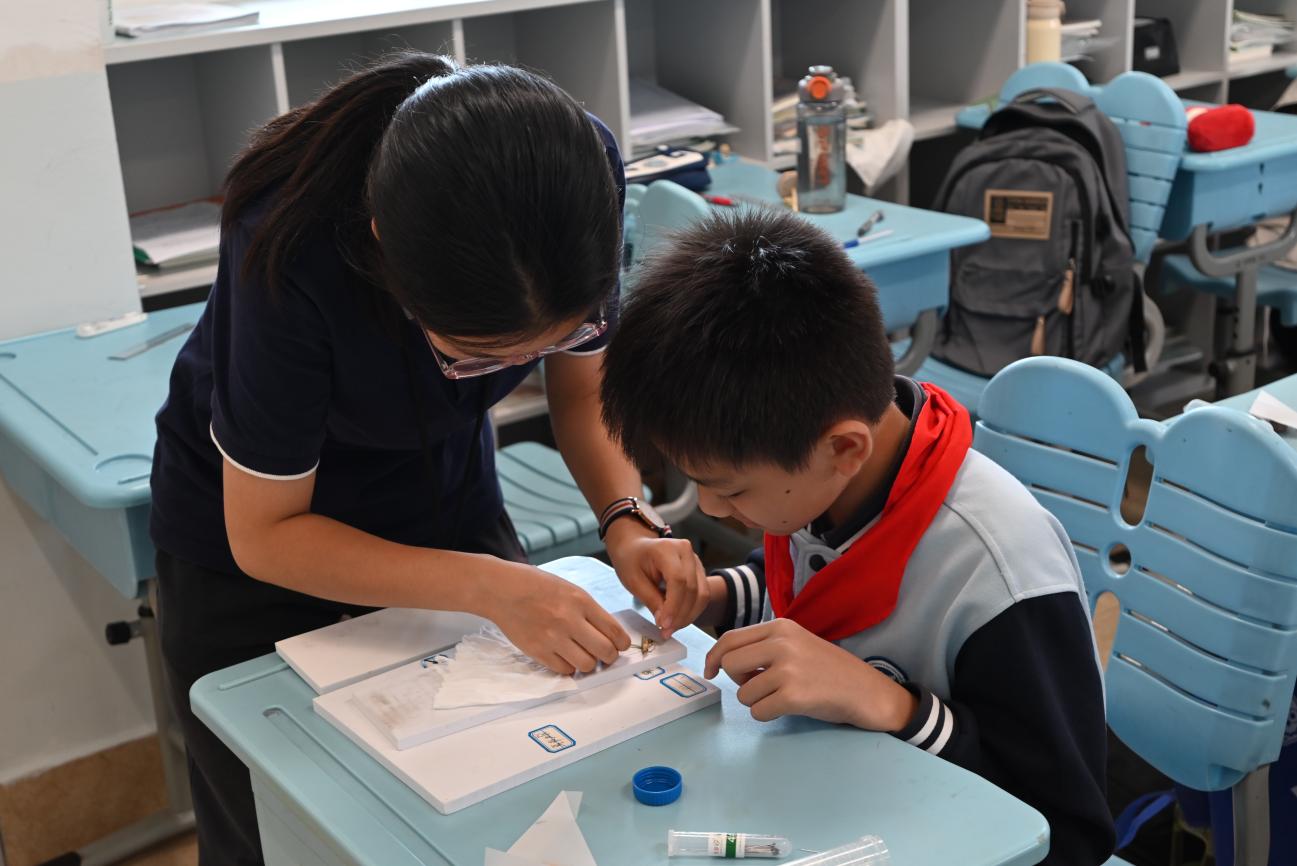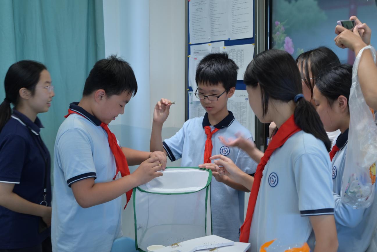 昆虫组的同学则在教室开展 “标本制作实践”。志愿者们演示了“直翅目昆虫整姿”和“鳞翅目展翅”两种主要的昆虫标本制作技巧:用针调整六足的位置并交叉固定,让蝗虫蚂蚱的六足清晰对称地展开在身体两侧;用温水浸泡干燥蝴蝶的身体和翅膀基部,缓慢用硫酸纸压开,展现出蝴蝶飞翔的姿态。七(5)班傅瑞杰同学小心翼翼地拨动蝗虫带刺的后腿,他说:“这个过程特别考验耐心,我感觉自己不是学生,而是在雕琢‘生态艺术品’,也更懂昆虫的结构之美了。”