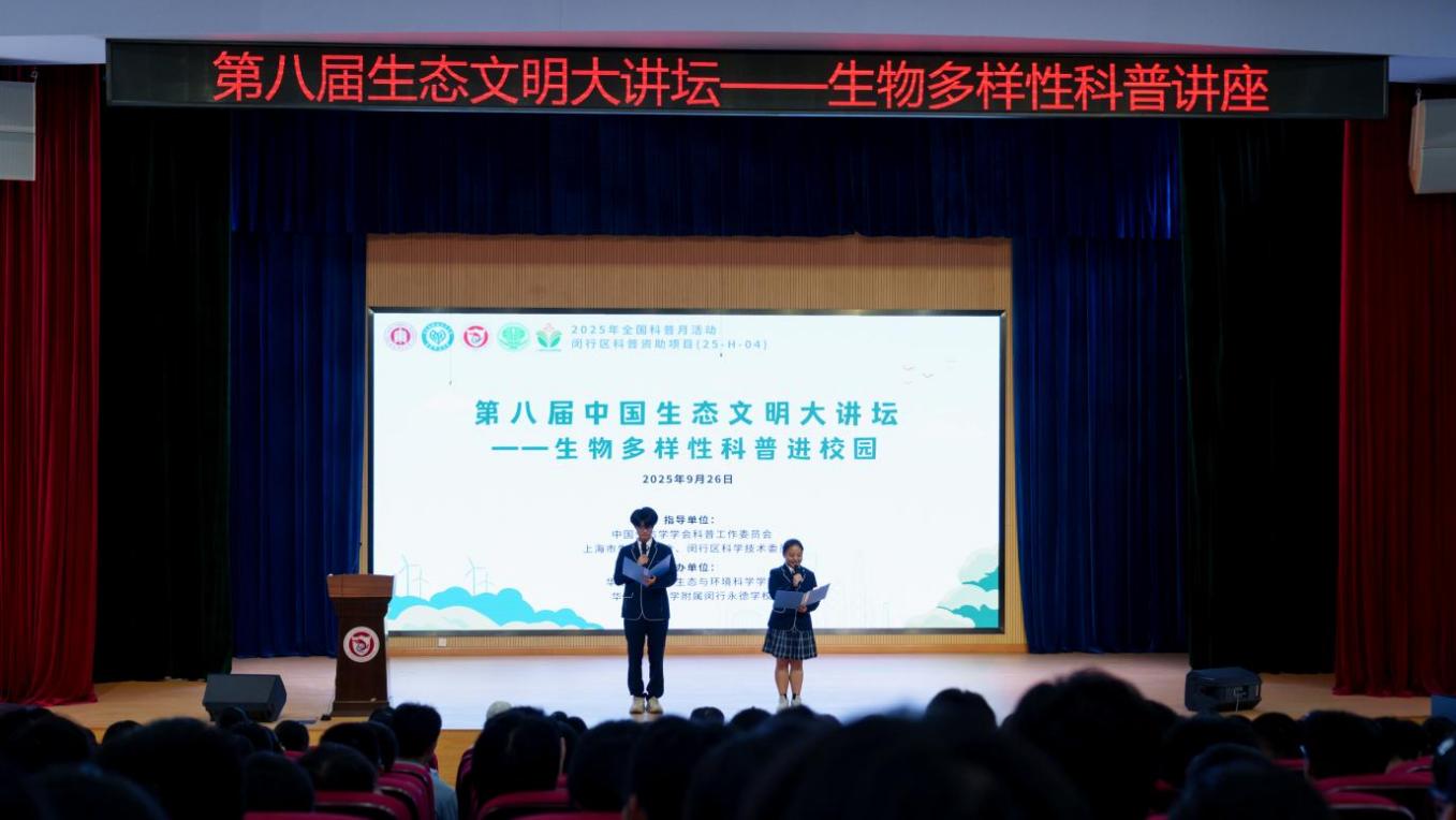 2025年9月26日下午,第八届中国生态文明大讲坛——生物多样性科普进校园分会场在华东师范大学附属闵行永德学校顺利举行。本次活动由中国生态学学会科普工作委员会和上海市生态学学会、华东师范大学主办,华东师范大学生态与环境科学学院联合永德学校承办,并得到了闵行区科普项目(25-H-04)支持。同学们通过主题讲座、科普展览、校园科学考察 “三维联动”,开启沉浸式生物多样性探索之旅,不仅收获满满干货,更掀起 “追科学偶像、践生态责任” 的热潮。