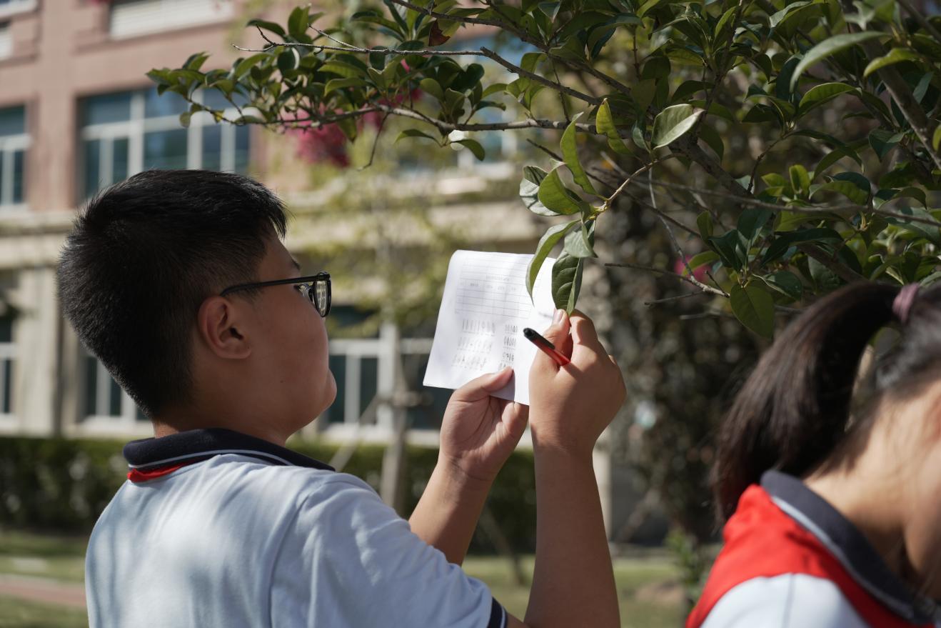 “帮我拉一下卷尺,我来记录胸径!”“这株灌木的覆盖度大概是多少?” 校园里,七、八年级的学生在华师大生环学院志愿者的带领下,分成“植物组”和“昆虫组”,开启 “接地气” 的科学考察体验。